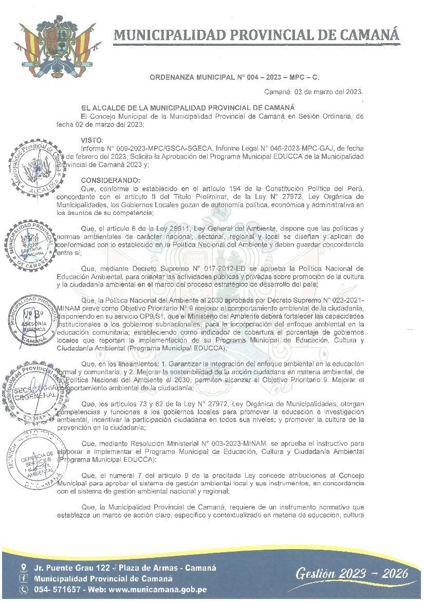 La presente Ordenanza aprueba el Programa Municipal de Educación, Cultura y Ciudadanía Ambiental de la Municipalidad Provincial de Camaná, Arequipa (Arequipa), con la finalidad de promover la cultura y la educación ambiental para la formación de ciudadanas y ciudadanos ambientalmente responsables e incentivar la participación ciudadana en todos sus niveles.