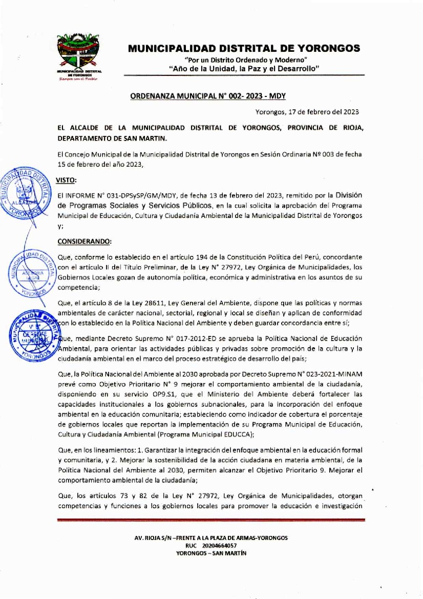 La presente Ordenanza aprueba el Programa Municipal de Educación, Cultura y Ciudadanía Ambiental de la Municipalidad Distrital de Yorongos; con la finalidad de promover la cultura y la educación ambiental para la formación de ciudadanas y ciudadanos ambientalmente responsables e incentivar la participación ciudadana en todos sus niveles.