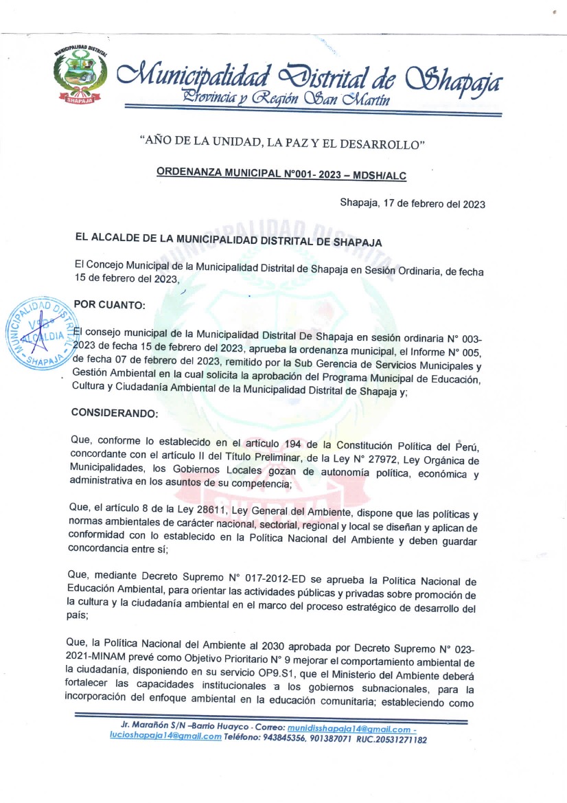 La presente Ordenanza aprueba el Programa Municipal de Educación, Cultura y Ciudadanía Ambiental de la Municipalidad Distrital de Shapaja; con la finalidad de promover la cultura y la educación ambiental para la formación de ciudadanas y ciudadanos ambientalmente responsables e incentivar la participación ciudadana en todos sus niveles.
