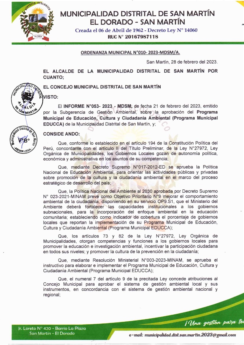 La presente Ordenanza aprueba el Programa Municipal de Educación, Cultura y Ciudadanía Ambiental de la Municipalidad Distrital de San Martín; con la finalidad de promover la cultura y la educación ambiental para la formación de ciudadanas y ciudadanos ambientalmente responsables e incentivar la participación ciudadana en todos sus niveles.