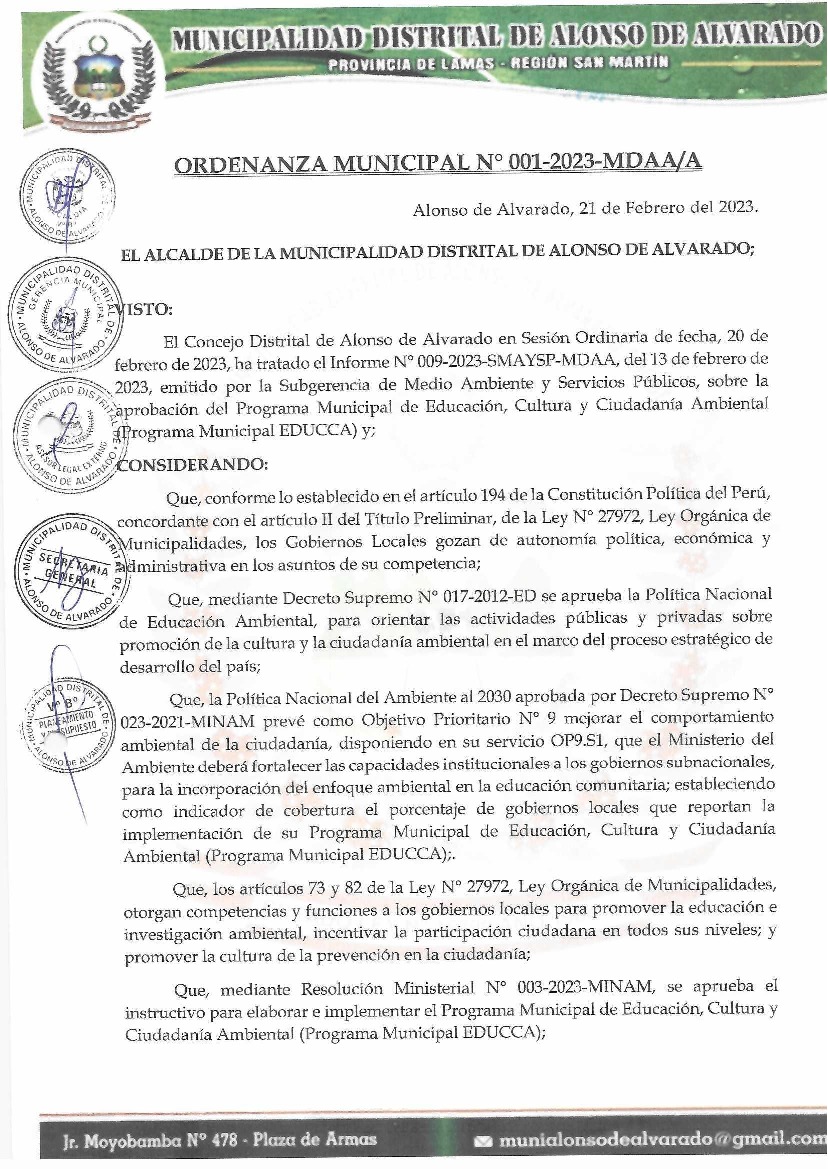 La presente Ordenanza aprueba el Programa Municipal de Educación, Cultura y Ciudadanía Ambiental de la Municipalidad Distrital de Alonso de Alvarado; con la finalidad de promover la cultura y la educación ambiental para la formación de ciudadanas y ciudadanos ambientalmente responsables e incentivar la participación ciudadana en todos sus niveles.