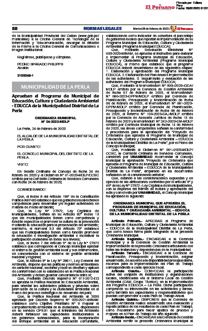 La presente Ordenanza aprueba el Programa Municipal de Educación, Cultura y Ciudadanía Ambiental de la Municipalidad Distrital de La Perla (Callao), con la finalidad de promover la cultura y la educación ambiental para la formación de ciudadanas y ciudadanos ambientalmente responsables e incentivar la participación ciudadana en todos sus niveles.