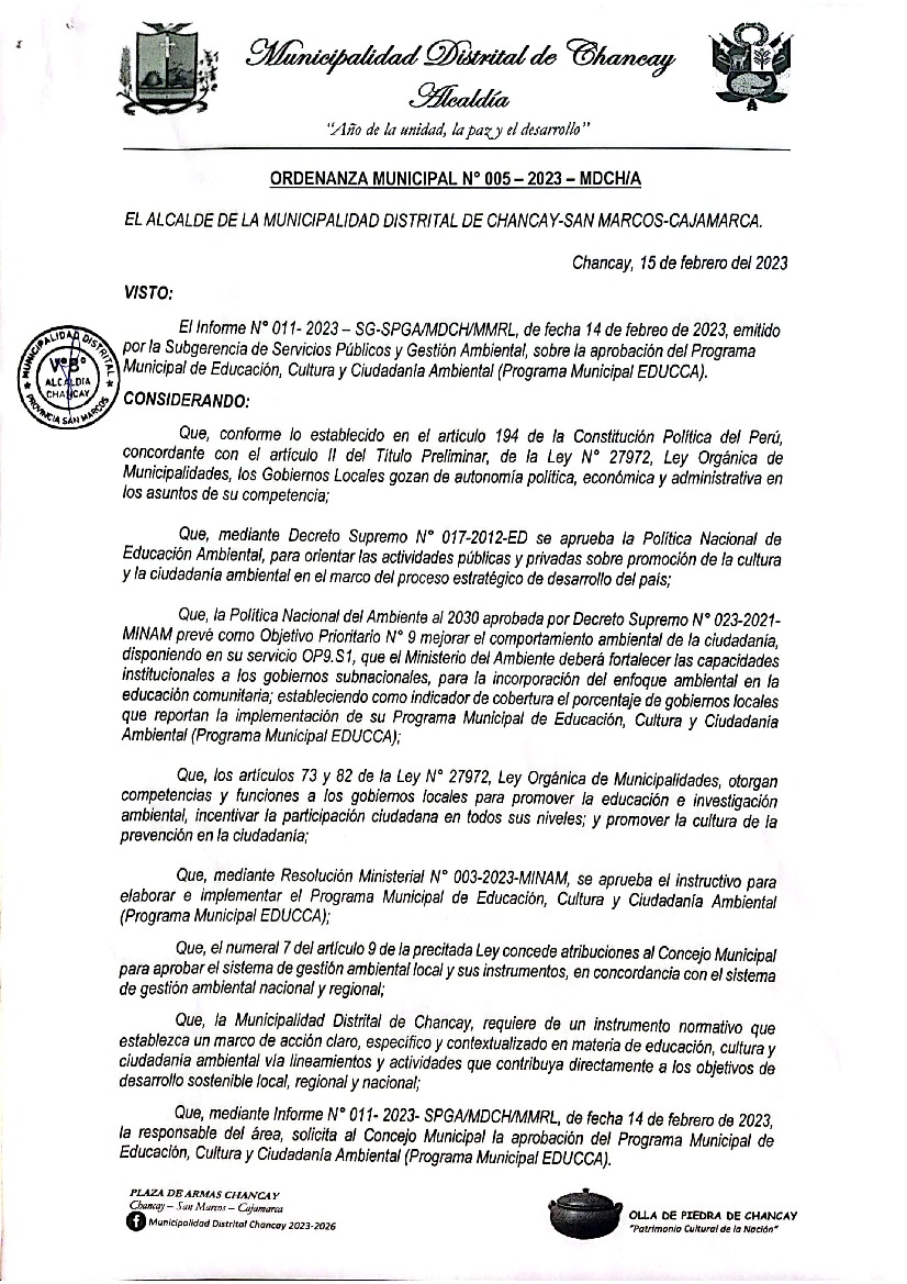 La presente Ordenanza aprueba el Programa Municipal de Educación, Cultura y Ciudadanía Ambiental de la Municipalidad Distrital de Chancay - San Marcos (Cajamarca); con la finalidad de promover la cultura y la educación ambiental para la formación de ciudadanas y ciudadanos ambientalmente responsables e incentivar la participación ciudadana en todos sus niveles.