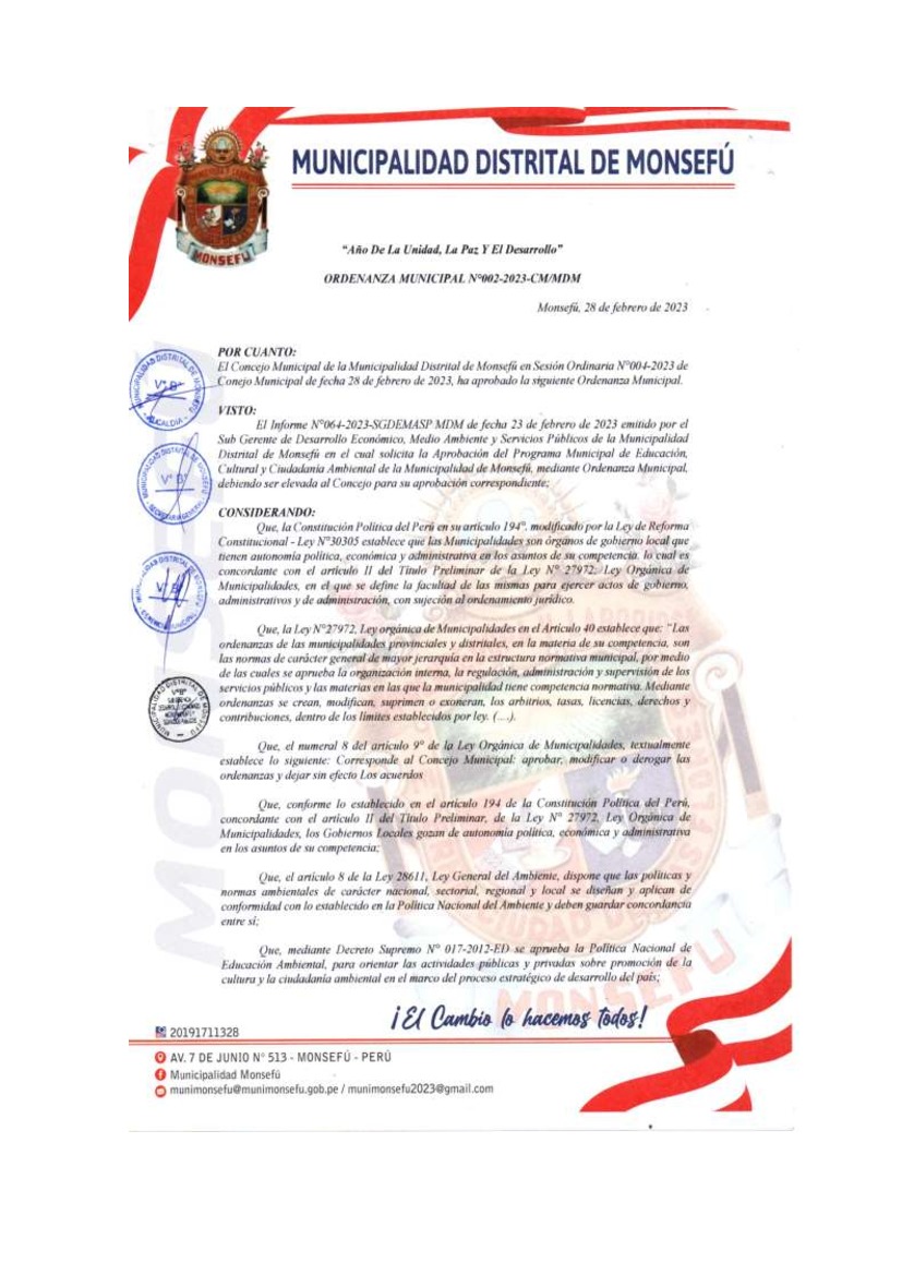 La presente Ordenanza aprueba el Programa Municipal de Educación, Cultura y Ciudadanía Ambiental de la Municipalidad Distrital de Monsefú - Chiclayo (Lambayeque); con la finalidad de promover la cultura y la educación ambiental para la formación de ciudadanas y ciudadanos ambientalmente responsables e incentivar la participación ciudadana en todos sus niveles.