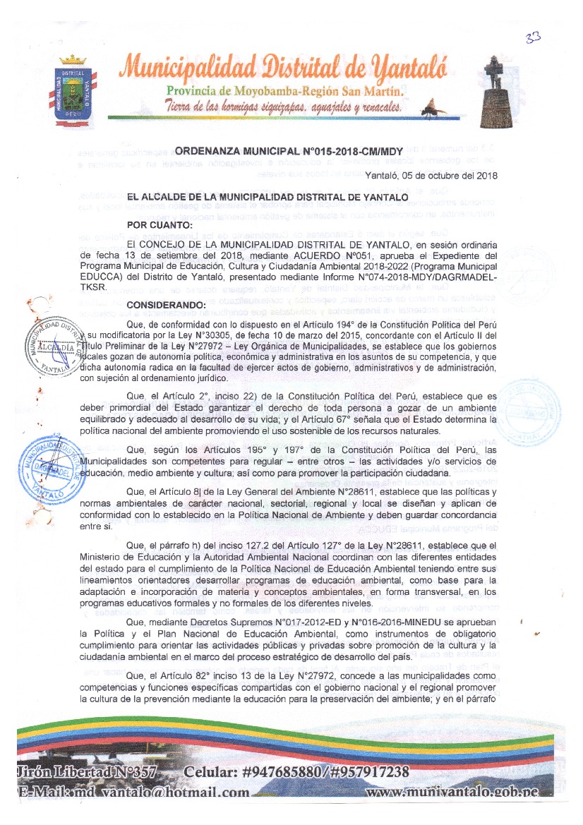 Programa Municipal de Educación, Cultura y Ciudadanía Ambiental de la Municipalidad Distrital de Yantaló 2018 - 2022