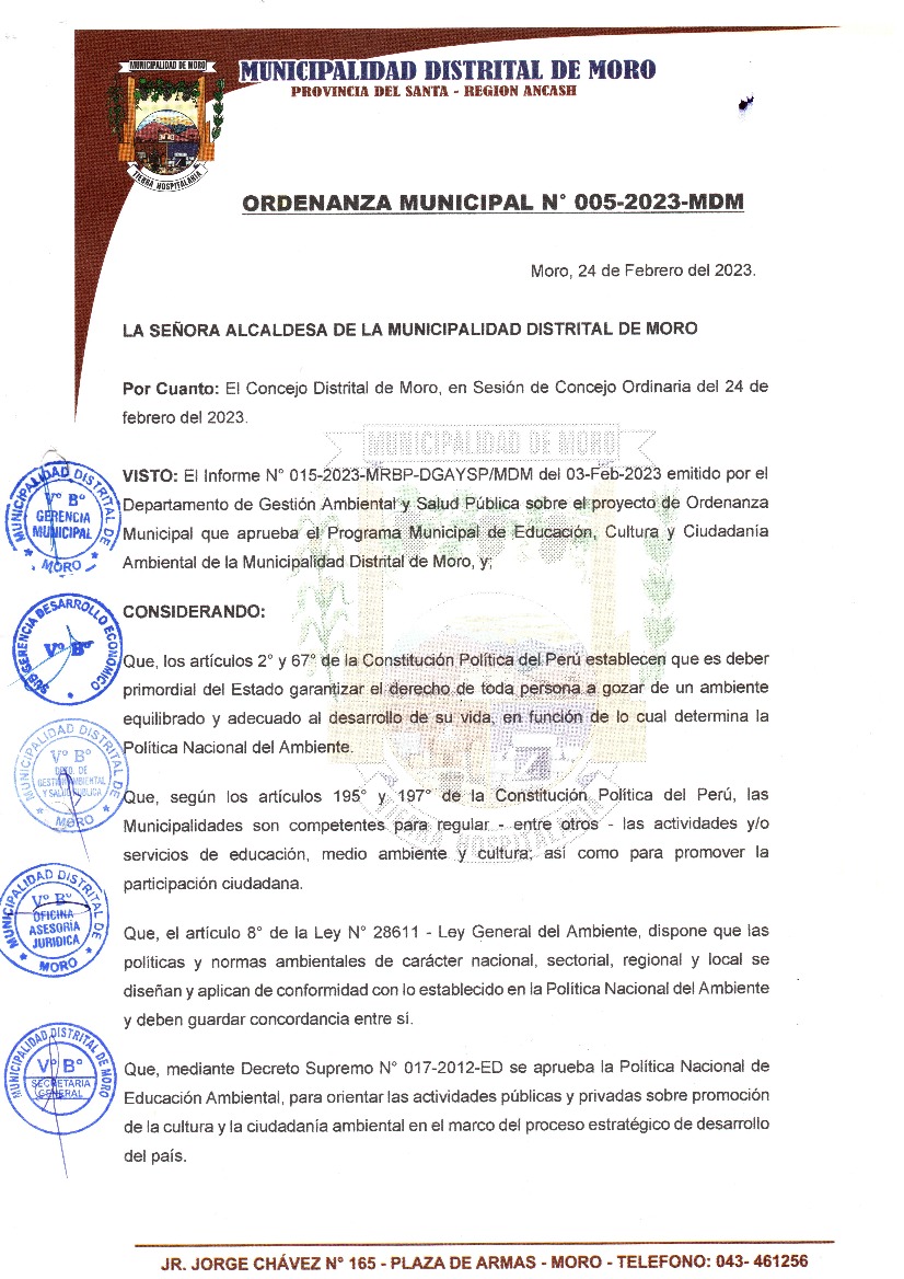 La presente Ordenanza aprueba el Programa Municipal de Educación, Cultura y Ciudadanía Ambiental de la Municipalidad Distrital de Moro - Santa (Ancash); con la finalidad de promover la cultura y la educación ambiental para la formación de ciudadanas y ciudadanos ambientalmente responsables e incentivar la participación ciudadana en todos sus niveles.