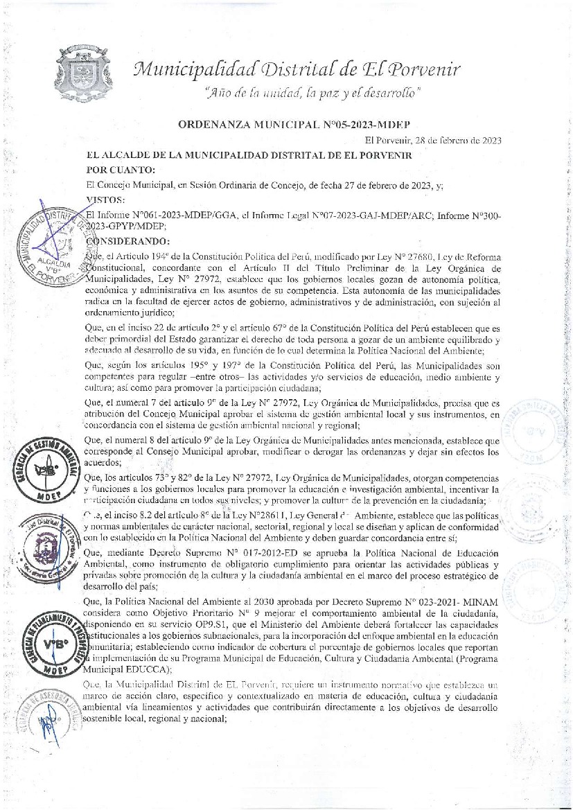 La presente Ordenanza aprueba el Programa Municipal de Educación, Cultura y Ciudadanía Ambiental de la Municipalidad Distrital de El Porvenir - Trujillo (La Libertad); con la finalidad de promover la cultura y la educación ambiental para la formación de ciudadanas y ciudadanos ambientalmente responsables e incentivar la participación ciudadana en todos sus niveles.