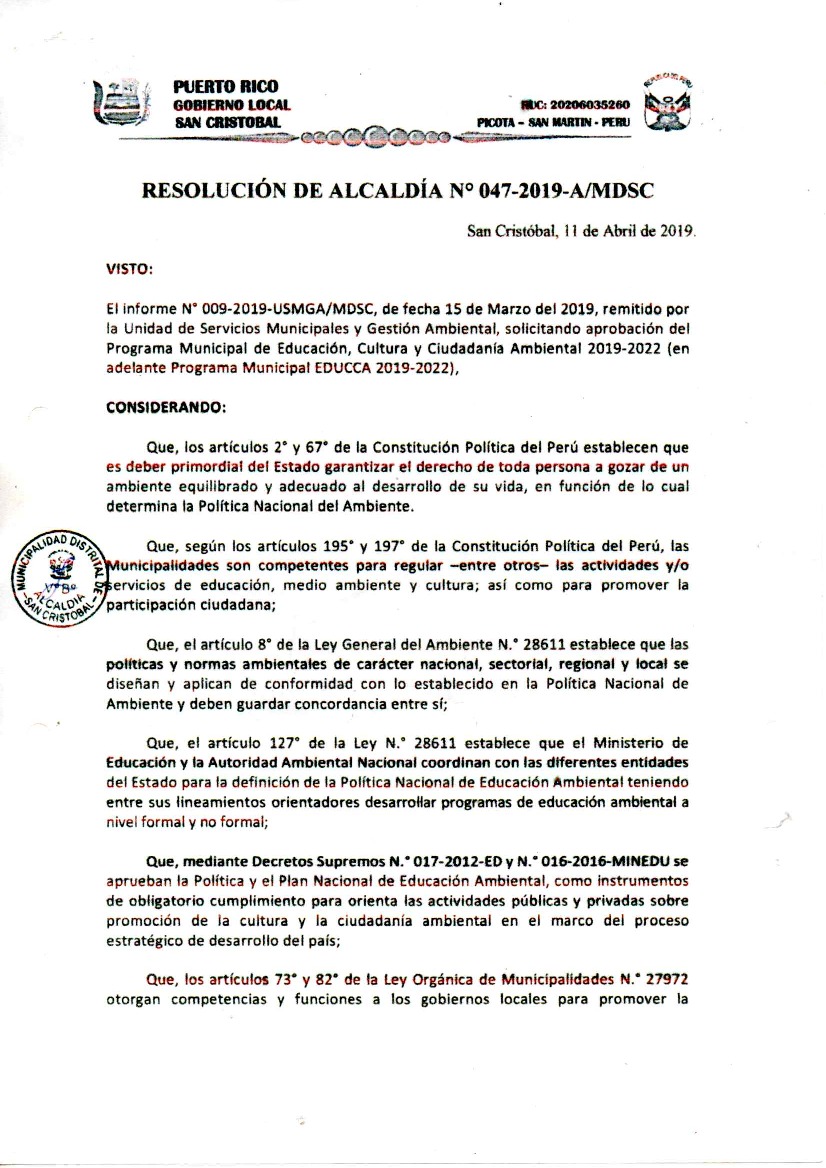 La presente Resolución aprueba el Programa Municipal de Educación, Cultura y Ciudadanía Ambiental de la Municipalidad Distrital de San Cristobal, para el periodo 2019 - 2022; con la finalidad de promover la cultura y la educación ambiental para la formación de ciudadanas y ciudadanos ambientalmente responsables e incentivar la participación ciudadana en todos sus niveles.