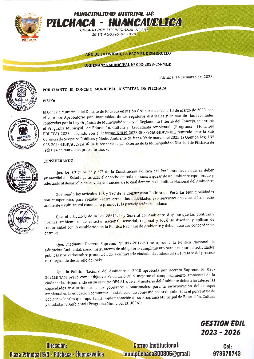 La presente Ordenanza Municipal aprueba el Programa Municipal de Educación, Cultura y Ciudadanía Ambiental de la Municipalidad Distrital de Pilchaca, con la finalidad de promover la cultura y la educación ambiental para la formación de ciudadanas y ciudadanos ambientalmente responsables e incentivar la participación ciudadana en todos sus niveles.