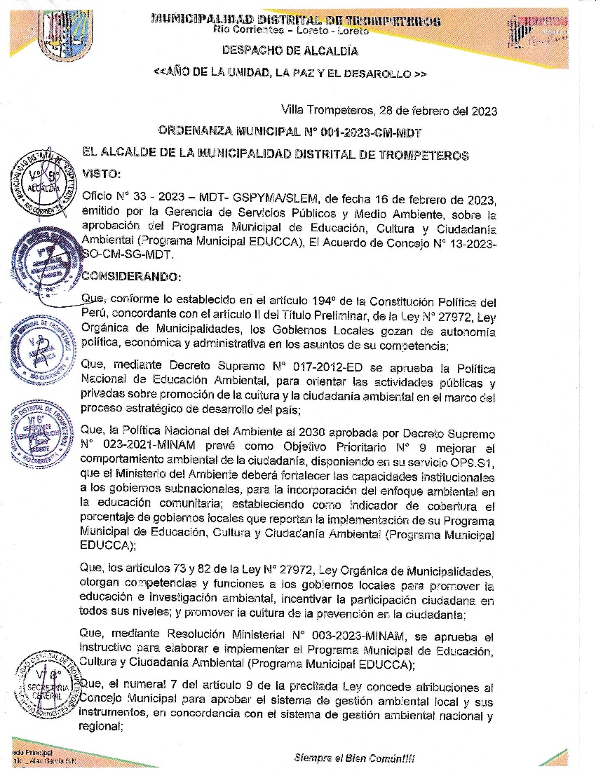 el Programa Municipal de Educación Cultura y Ciudadanía Ambiental de la Municipalidad Distrital de Trompeteros, Provincia de Loreto (Loreto)