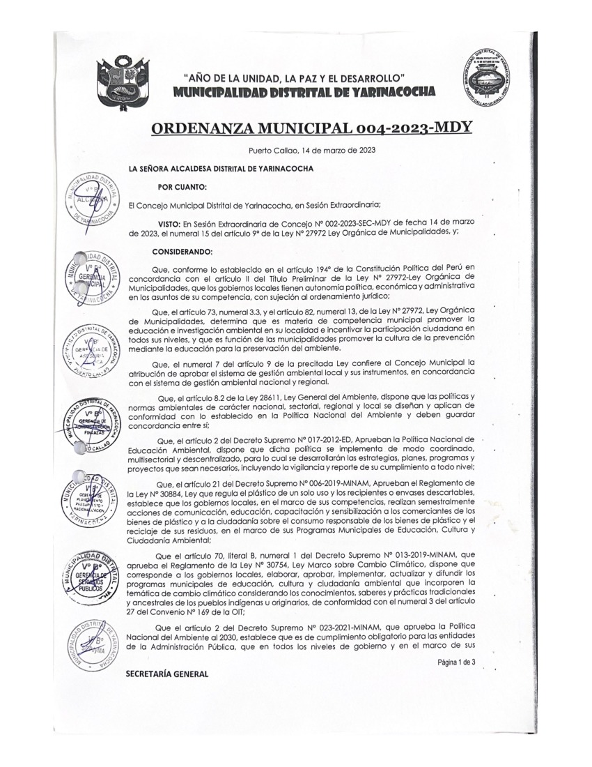 La presente Ordenanza aprueba el Programa Municipal de Educación Cultura y Ciudadanía Ambiental de la Municipalidad Distrital de Yarinacocha, provincia de Coronel Portillo, región Ucayali, con la finalidad de promover la cultura y la educación ambiental para la formación de ciudadanas y ciudadanos ambientalmente responsables, e incentivar la participación ciudadana en la gestión ambiental.