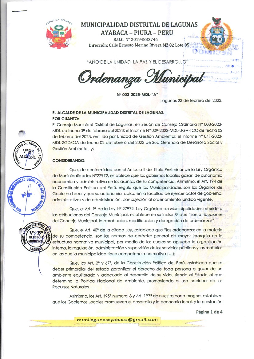 La presente Ordenanza aprueba el Programa Municipal de Educación, Cultura y Ciudadanía Ambiental de la Municipalidad Distrital de Lagunas - Ayabaca (Piura); con la finalidad de promover la cultura y la educación ambiental para la formación de ciudadanas y ciudadanos ambientalmente responsables e incentivar la participación ciudadana en todos sus niveles.