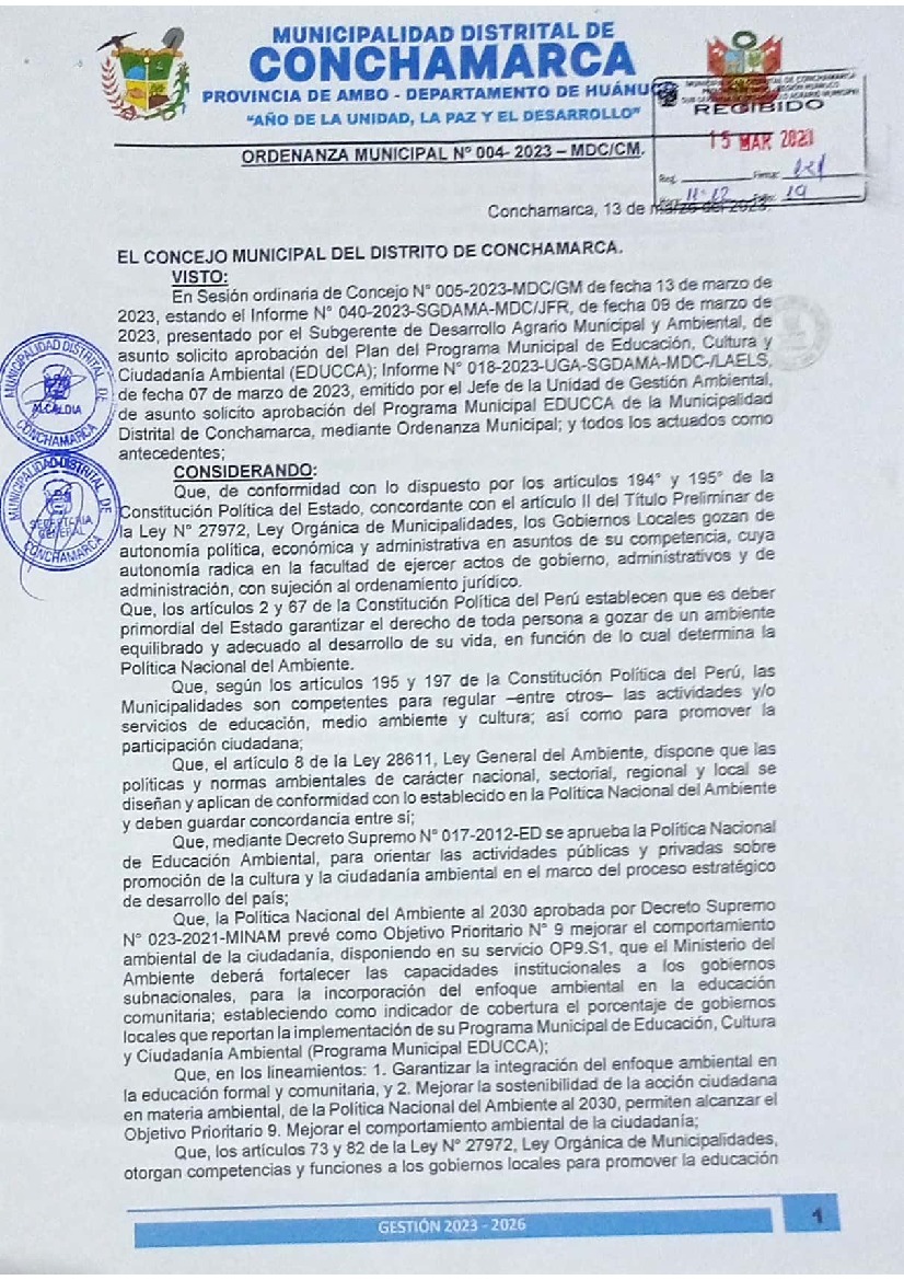 La presente Ordenanza aprueba el Programa Municipal de Educación, Cultura y Ciudadanía Ambiental de la Municipalidad Distrital de Conchamarca - Ambo (Huánuco); con la finalidad de promover la cultura y la educación ambiental para la formación de ciudadanas y ciudadanos ambientalmente responsables e incentivar la participación ciudadana en todos sus niveles.