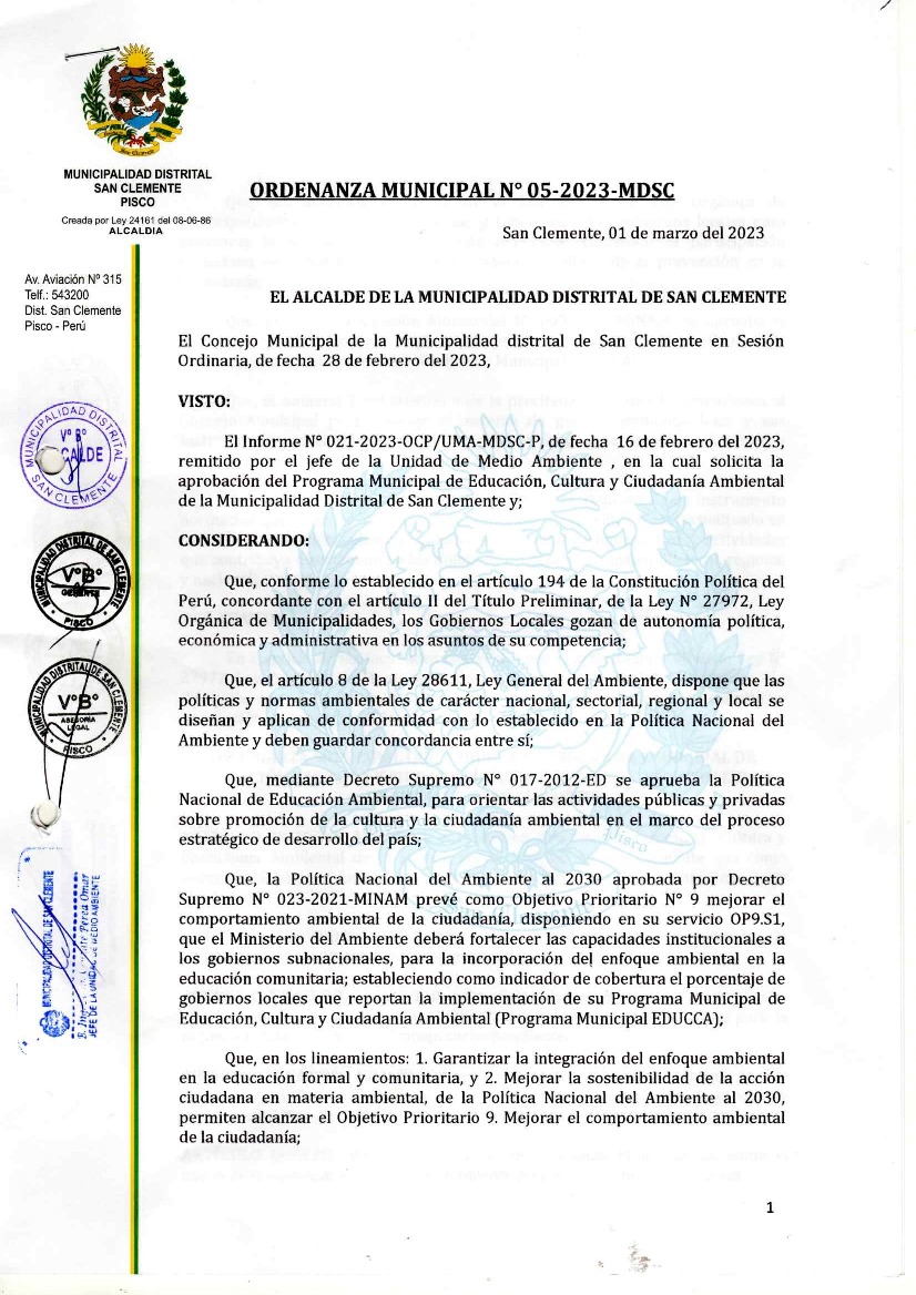 La presente Ordenanza aprueba el Programa Municipal de Educación, Cultura y Ciudadanía Ambiental de la Municipalidad Distrital de San Clemente - Pisco (Ica), con la finalidad de promover la cultura y la educación ambiental para la formación de ciudadanas y ciudadanos ambientalmente responsables e incentivar la participación ciudadana en todos sus niveles.
