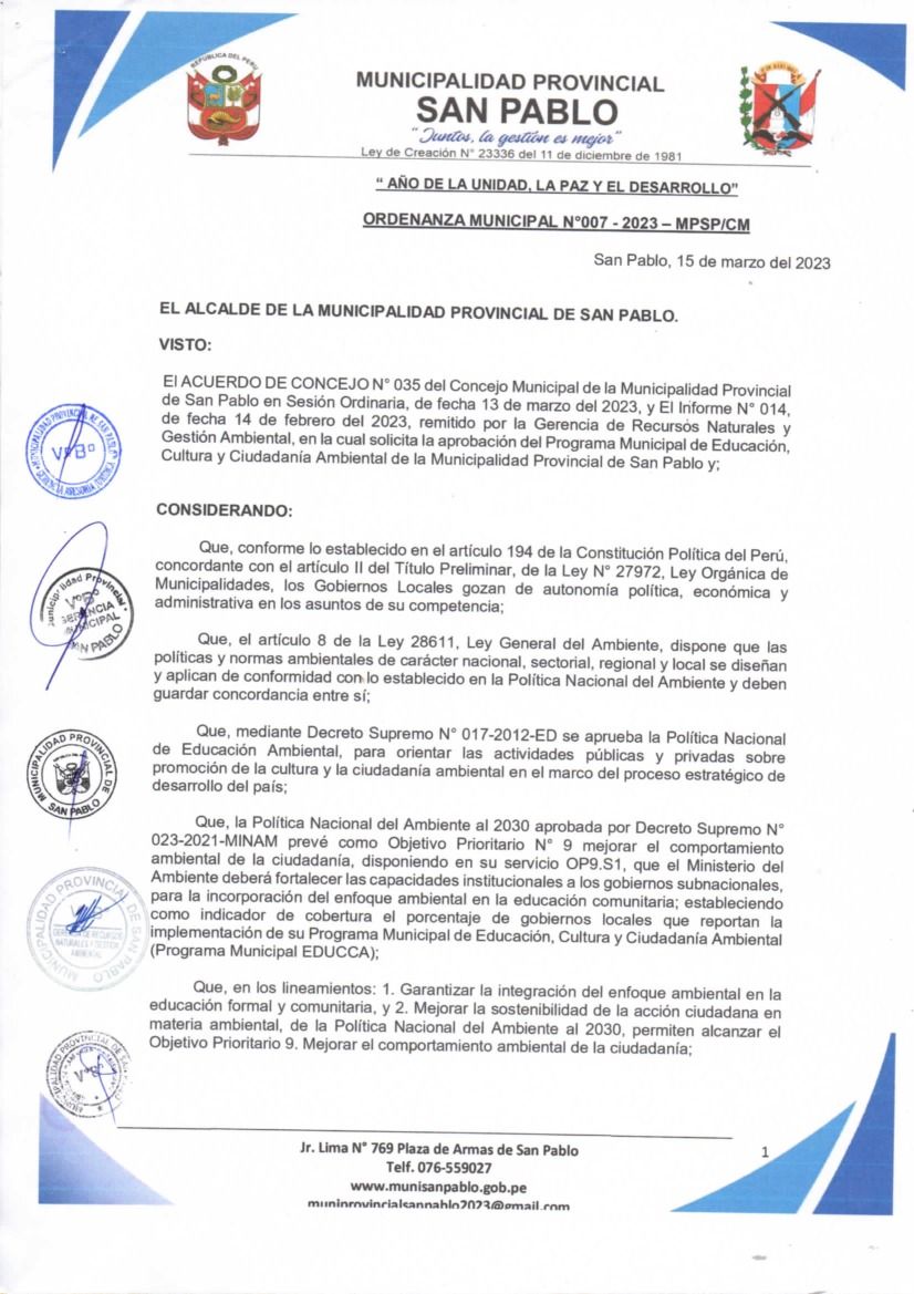 La presente Ordenanza aprueba el Programa Municipal de Educación, Cultura y Ciudadanía Ambiental de la Municipalidad Provincial de San Pablo - San Pablo (San Martín); con la finalidad de promover la cultura y la educación ambiental para la formación de ciudadanas y ciudadanos ambientalmente responsables e incentivar la participación ciudadana en todos sus niveles.