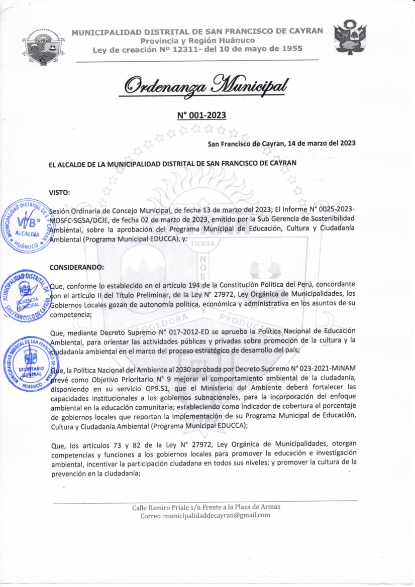 La presente Ordenanza aprueba el Programa Municipal de Educación, Cultura y Ciudadanía Ambiental de la Municipalidad Distrital de San Francisco de Cayran - Huánuco (HUÁNUCO); con la finalidad de promover la cultura y la educación ambiental para la formación de ciudadanas y ciudadanos ambientalmente responsables e incentivar la participación ciudadana en todos sus niveles.