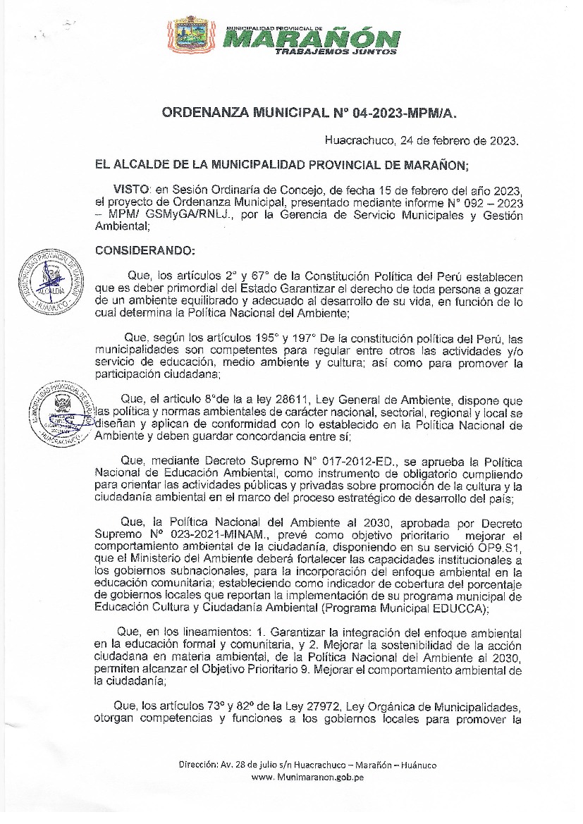 La presente Ordenanza aprueba el Programa Municipal de Educación, Cultura y Ciudadanía Ambiental de la Municipalidad Provincial de Marañón (HUÁNUCO); con la finalidad de promover la cultura y la educación ambiental para la formación de ciudadanas y ciudadanos ambientalmente responsables e incentivar la participación ciudadana en todos sus niveles.