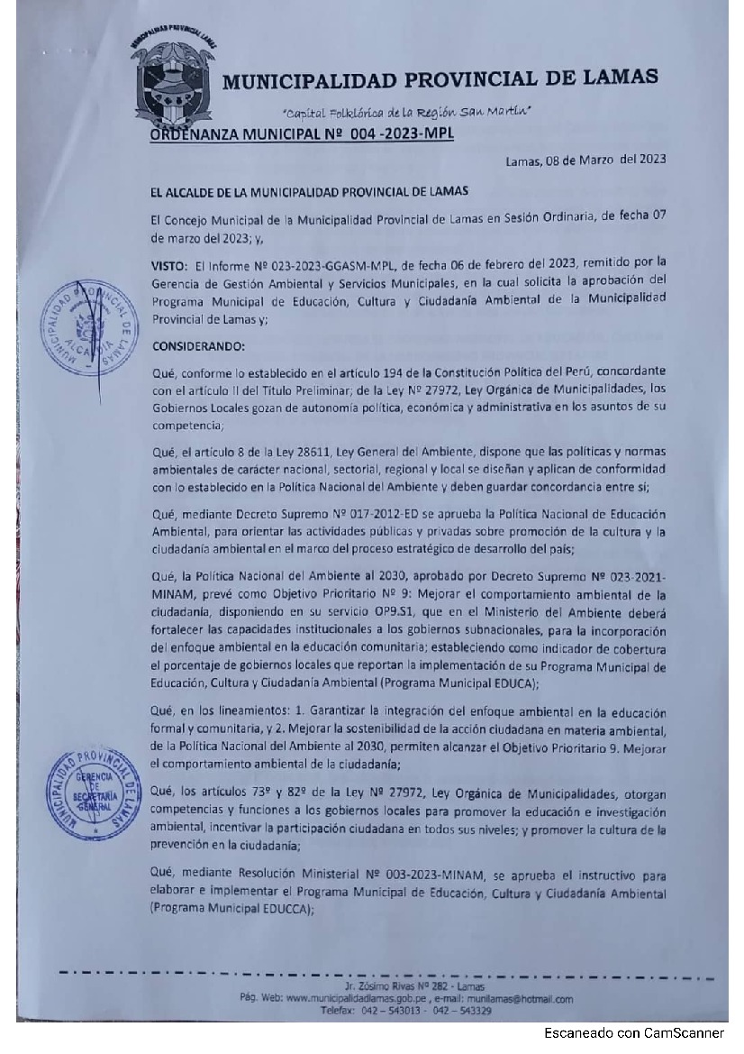 La presente Ordenanza aprueba el Programa Municipal de Educación, Cultura y Ciudadanía Ambiental de la Municipalidad Provincial de Lamas - Lamas (San Martín); con la finalidad de promover la cultura y la educación ambiental para la formación de ciudadanas y ciudadanos ambientalmente responsables e incentivar la participación ciudadana en todos sus niveles