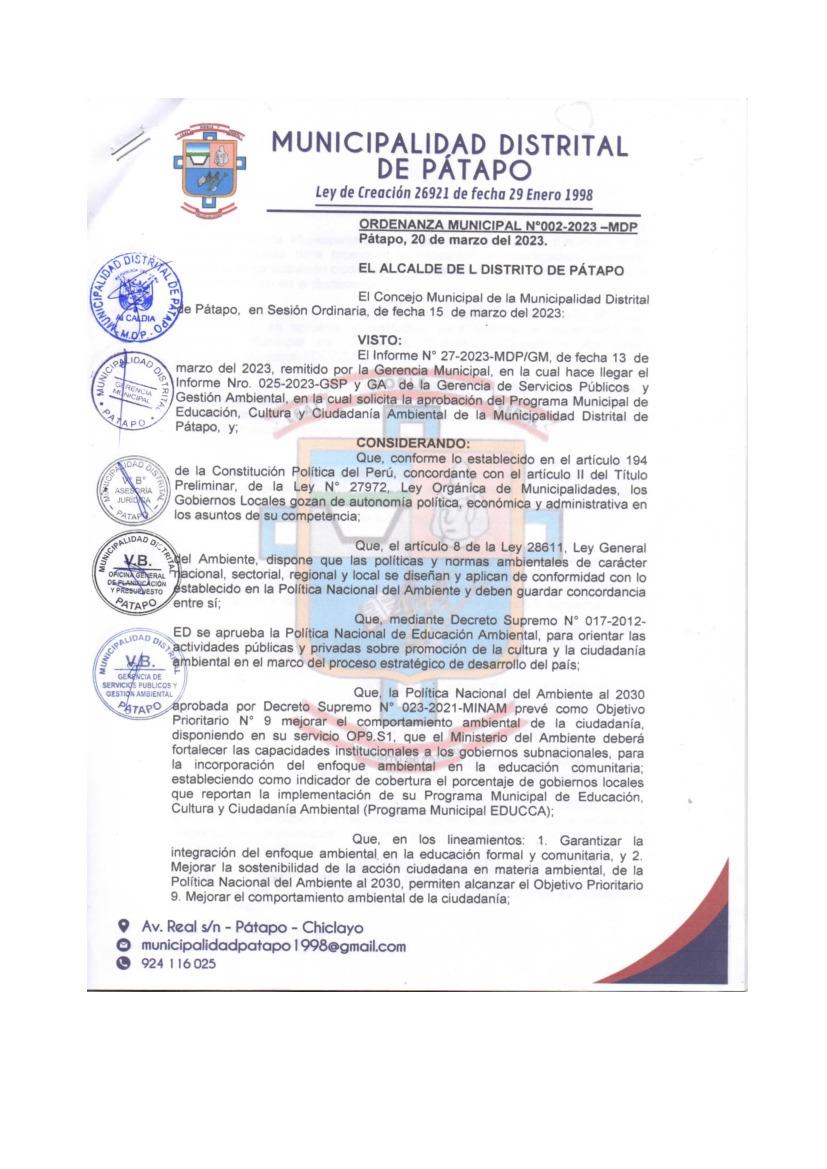 La presente Ordenanza aprueba el Programa Municipal de Educación, Cultura y Ciudadanía Ambiental de la Municipalidad Distrital de Patapo - Chiclayo (Lambayeque); con la finalidad de promover la cultura y la educación ambiental para la formación de ciudadanas y ciudadanos ambientalmente responsables e incentivar la participación ciudadana en todos sus niveles.