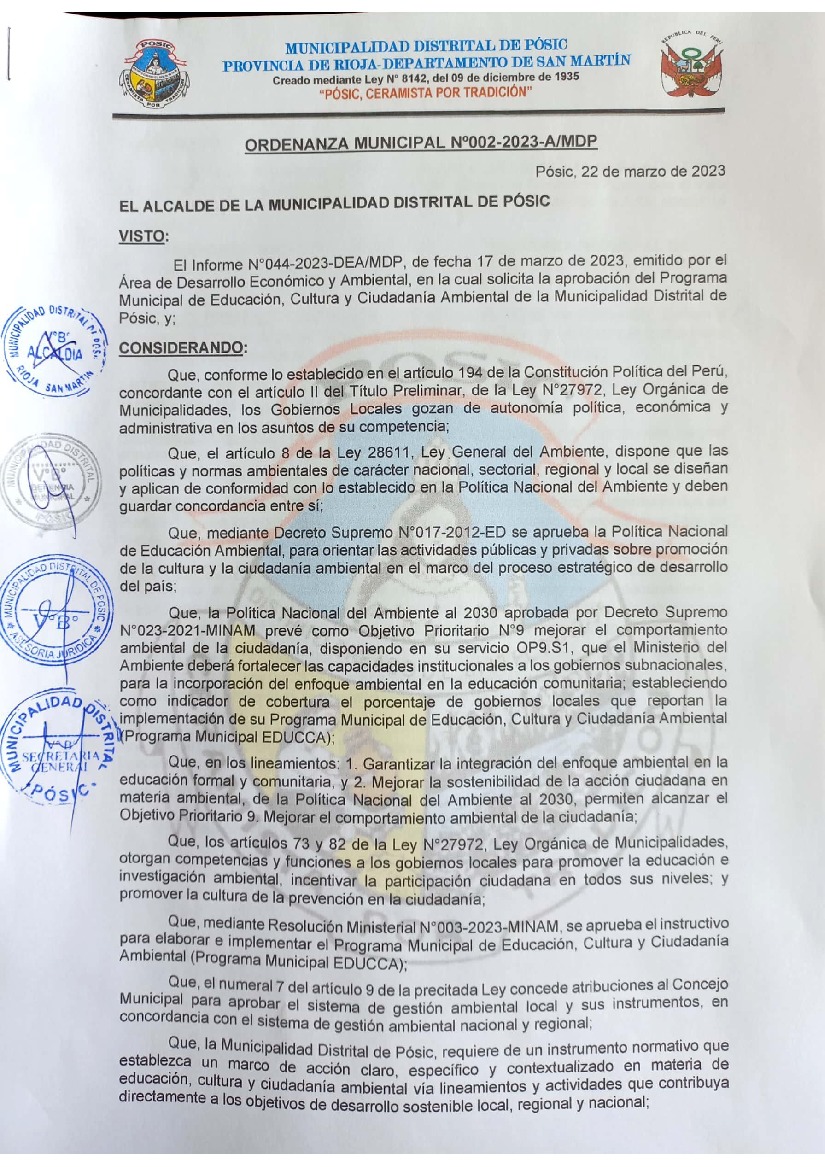 La presente Ordenanza aprueba el Programa Municipal de Educación, Cultura y Ciudadanía Ambiental de la Municipalidad Distrital de Pósic - Rioja (San Martín); con la finalidad de promover la cultura y la educación ambiental para la formación de ciudadanas y ciudadanos ambientalmente responsables e incentivar la participación ciudadana en todos sus niveles.