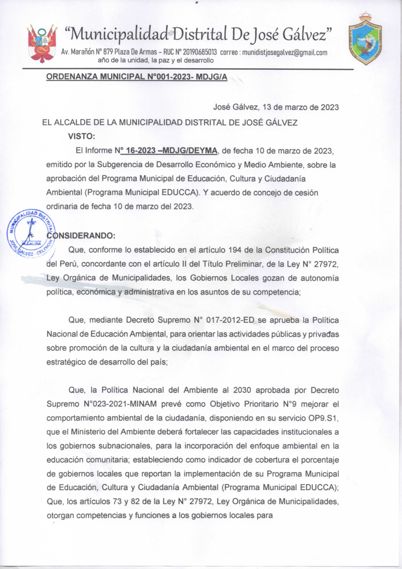 La presente Ordenanza aprueba el Programa Municipal de Educación, Cultura y Ciudadanía Ambiental de la Municipalidad Distrital de José Gálvez - Celendín (Cajamarca); con la finalidad de promover la cultura y la educación ambiental para la formación de ciudadanas y ciudadanos ambientalmente responsables e incentivar la participación ciudadana en todos sus niveles.