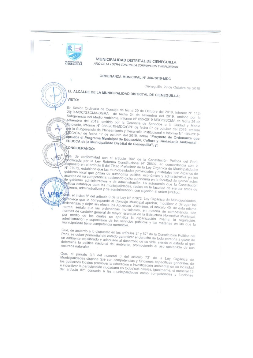 La presente Ordenanza aprueba el Programa Municipal de Educación, Cultura y Ciudadanía Ambiental de la Municipalidad Distrital de Cieneguilla, para el periodo 2019 - 2022; con la finalidad de promover la cultura y la educación ambiental para la formación de ciudadanas y ciudadanos ambientalmente responsables e incentivar la participación ciudadana en todos sus niveles