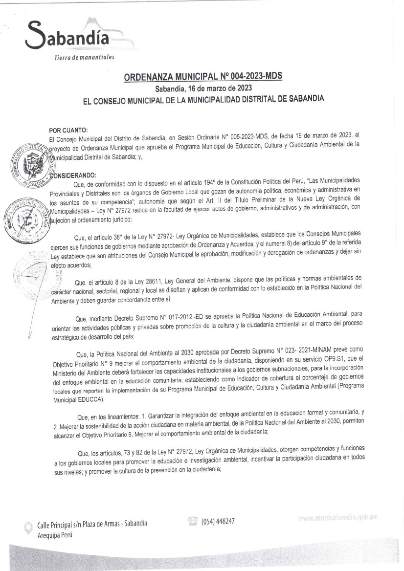 La presente Ordenanza aprueba el Programa Municipal de Educación, Cultura y Ciudadanía Ambiental de la Municipalidad Distrital de Sabandia - Arequipa (Arequipa), con la finalidad de promover la cultura y la educación ambiental para la formación de ciudadanas y ciudadanos ambientalmente responsables e incentivar la participación ciudadana en todos sus niveles.