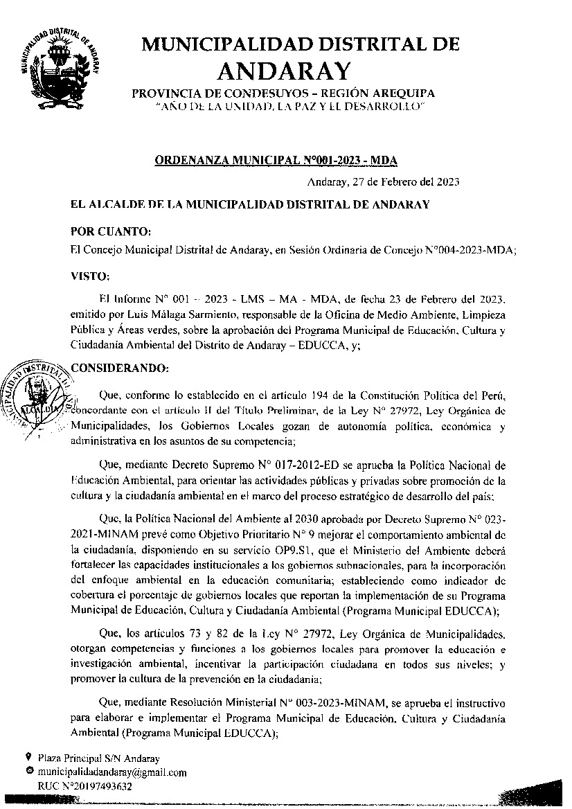 La presente Ordenanza aprueba el Programa Municipal de Educación, Cultura y Ciudadanía Ambiental de la Municipalidad Distrital de Andaray - Condesuyos (Arequipa), con la finalidad de promover la cultura y la educación ambiental para la formación de ciudadanas y ciudadanos ambientalmente responsables e incentivar la participación ciudadana en todos sus niveles.