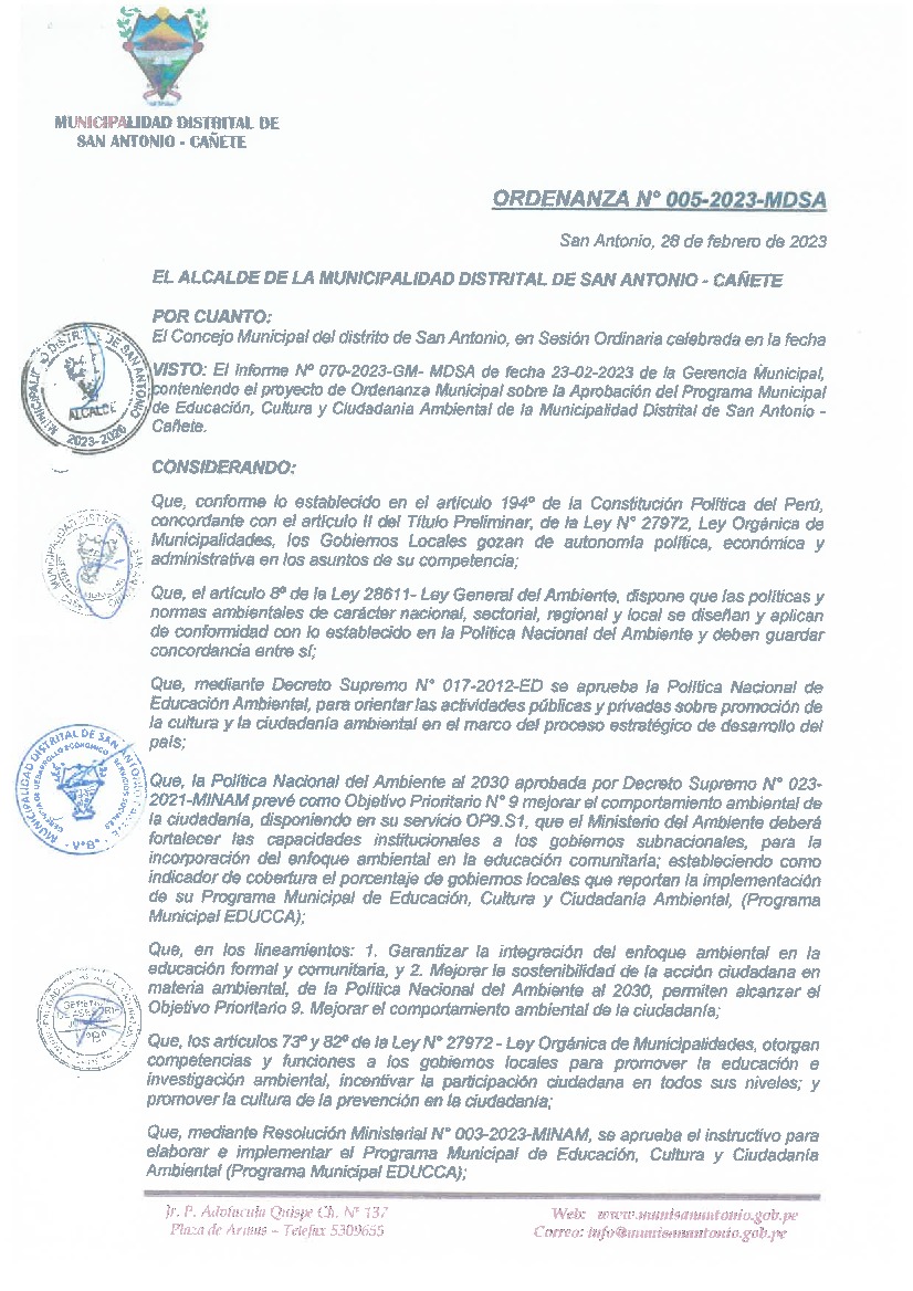 La presente Ordenanza aprueba el Programa Municipal de Educación, Cultura y Ciudadanía Ambiental de la Municipalidad Distrital de San Antonio - Cañete (Lima), con la finalidad de promover la cultura y la educación ambiental para la formación de ciudadanas y ciudadanos ambientalmente responsables e incentivar la participación ciudadana en todos sus niveles.