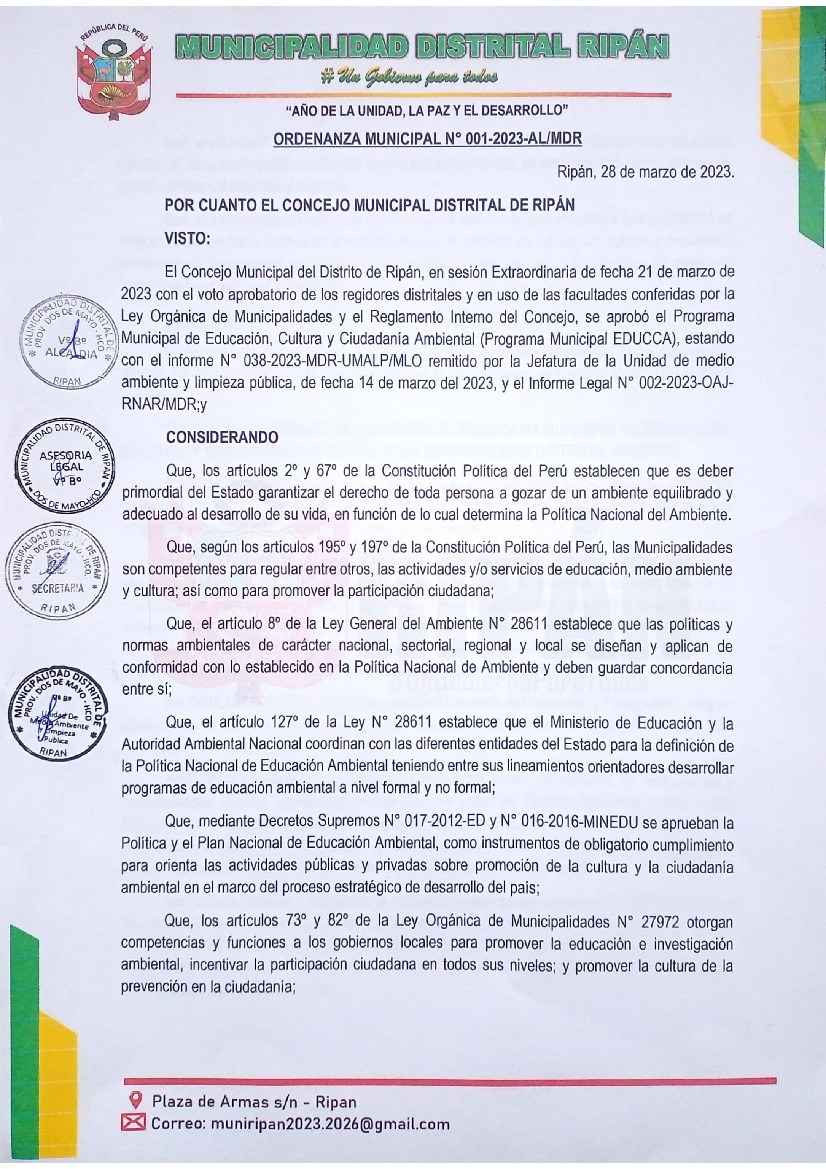 La presente Ordenanza aprueba el Programa Municipal de Educación, Cultura y Ciudadanía Ambiental de la Municipalidad Distrital de Ripan - Dos de Mayo (Huánuco); con la finalidad de promover la cultura y la educación ambiental para la formación de ciudadanas y ciudadanos ambientalmente responsables e incentivar la participación ciudadana en todos sus niveles.