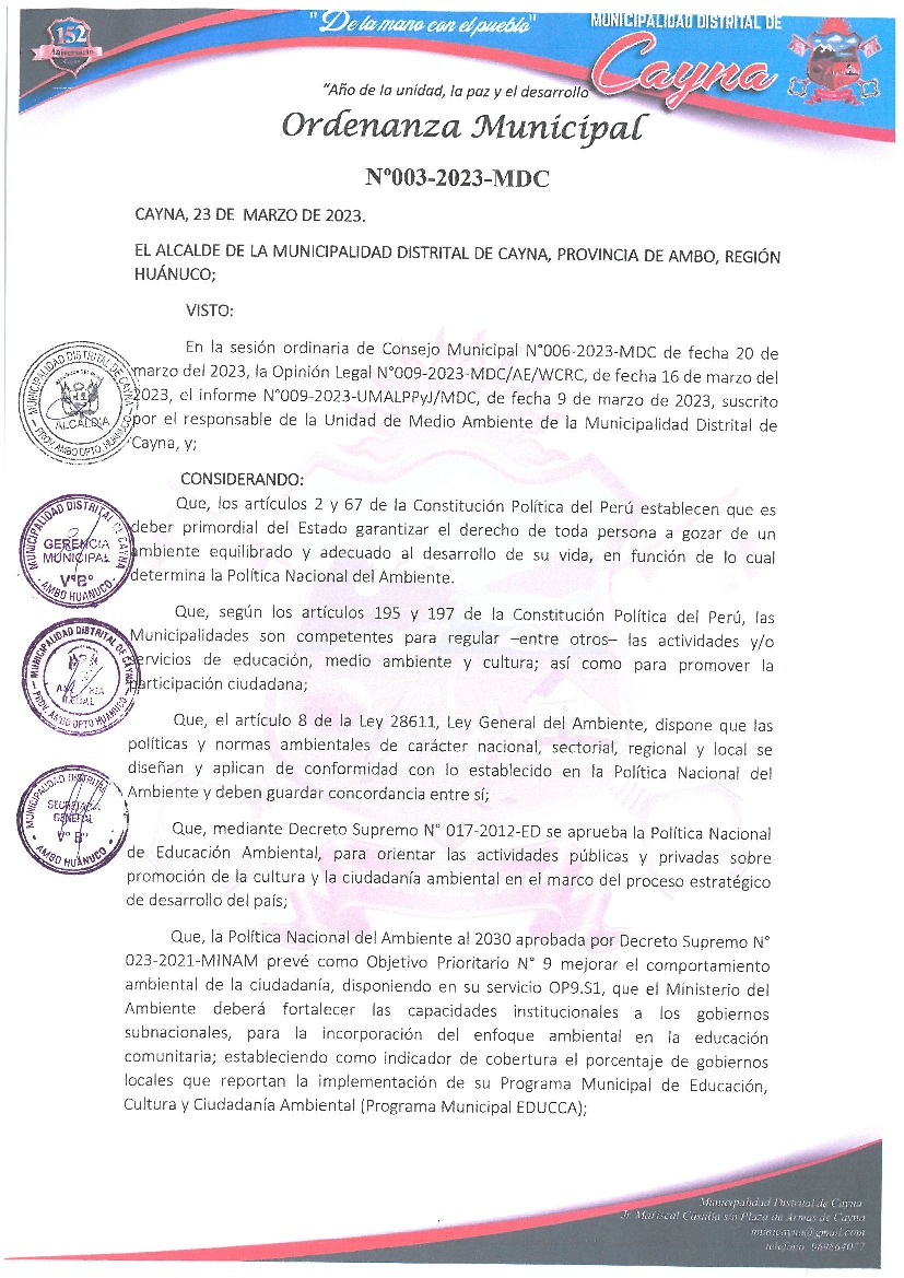 La presente Ordenanza aprueba el Programa Municipal de Educación, Cultura y Ciudadanía Ambiental de la Municipalidad Distrital de Cayna - Ambo (Huánuco); con la finalidad de promover la cultura y la educación ambiental para la formación de ciudadanas y ciudadanos ambientalmente responsables e incentivar la participación ciudadana en todos sus niveles.