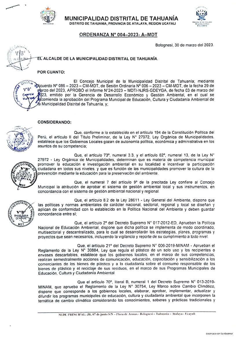 La presente Ordenanza aprueba el Programa Municipal de Educación, Cultura y Ciudadanía Ambiental de la Municipalidad Distrital de Tahuanía, provincia de Atalaya, región Ucayali, con la finalidad de promover la cultura y la educación ambiental para la formación de ciudadanas y ciudadanos ambientalmente responsables, e incentivar la participación ciudadana en la gestión ambiental.