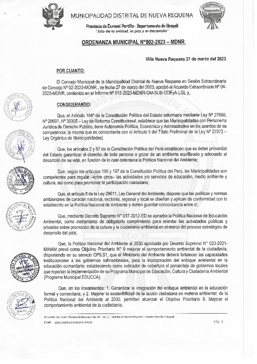 La presente Ordenanza aprueba el Programa Municipal de Educación, Cultura y Ciudadanía Ambiental de la Municipalidad Distrital de Nueva Requena, provincia de Coronel Portillo, región Ucayali, con la finalidad de promover la cultura y la educación ambiental para la formación de ciudadanas y ciudadanos ambientalmente responsables, e incentivar la participación ciudadana en la gestión ambiental.