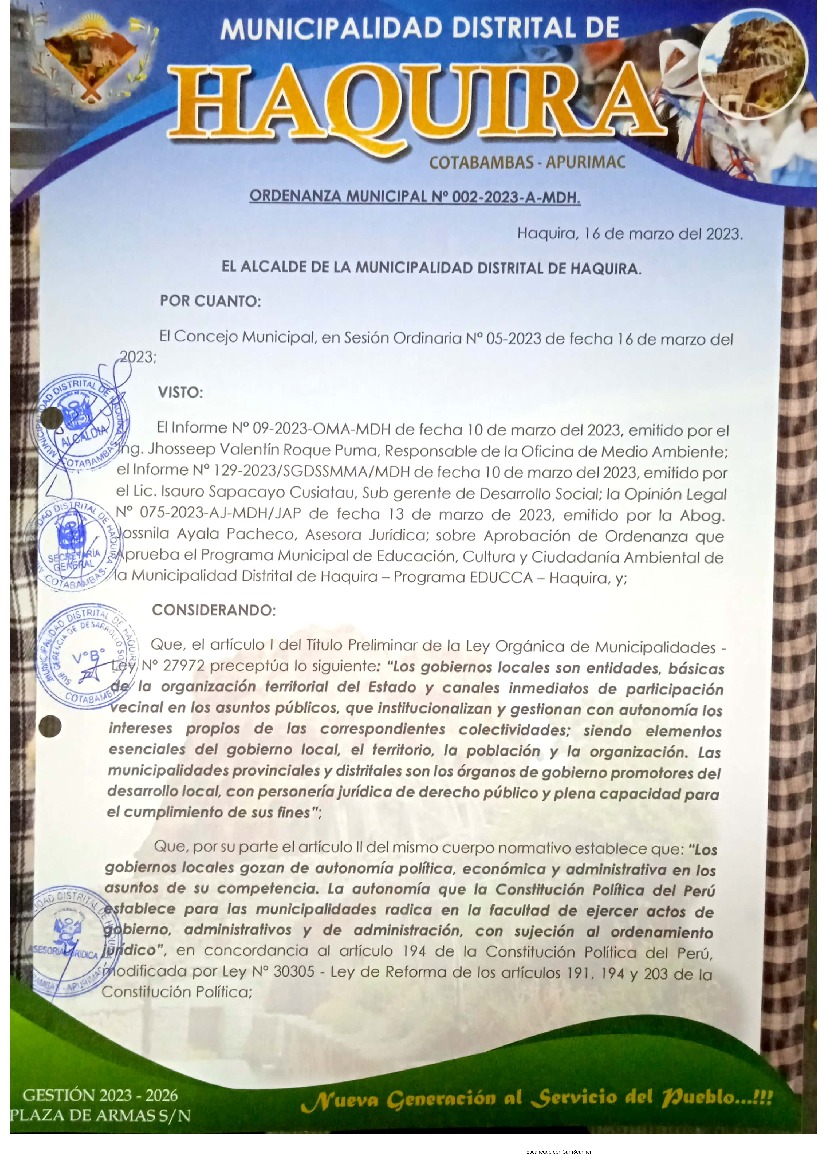 La presente Ordenanza aprueba el Programa Municipal de Educación, Cultura y Ciudadanía Ambiental de la Municipalidad Distrital de Haquira, provincia de Cotabambas, región Apurímac, con la finalidad de promover la cultura y la educación ambiental para la formación de ciudadanas y ciudadanos ambientalmente responsables, e incentivar la participación ciudadana en la gestión ambiental.
