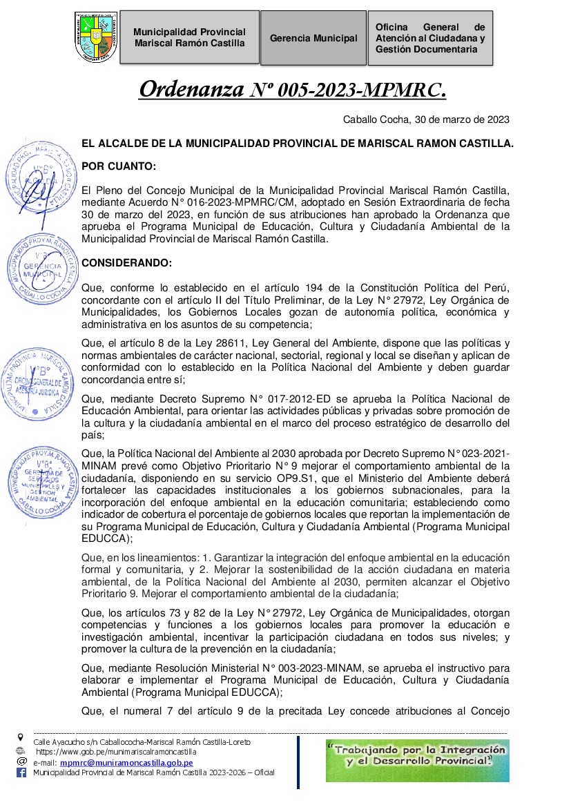 La presente Ordenanza aprueba el Programa Municipal de Educación Cultura y Ciudadanía Ambiental de la Municipalidad Provincial de Ramón Castilla (Loreto) con la finalidad de promover la cultura y la educación ambiental para la formación de ciudadanas y ciudadanos ambientalmente responsables e incentivar la participación ciudadana en todos sus niveles.