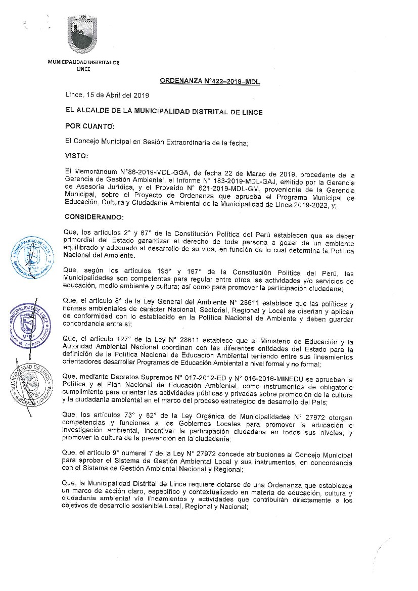 La presente Ordenanza aprueba el Programa Municipal de Educación, Cultura y Ciudadanía Ambiental de la Municipalidad Distrital de Lince, para el periodo 2019- 2022; con la finalidad de promover la cultura y la educación ambiental para la formación de ciudadanas y ciudadanos ambientalmente responsables e incentivar la participación ciudadana en todos sus niveles.