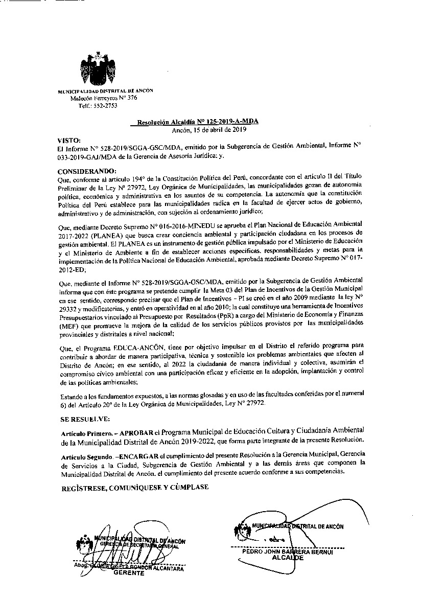 La presente Resolución aprueba el Programa Municipal de Educación, Cultura y Ciudadanía Ambiental de la Municipalidad Distrital de Ancón, para el periodo 2019- 2022; con la finalidad de promover la cultura y la educación ambiental para la formación de ciudadanas y ciudadanos ambientalmente responsables e incentivar la participación ciudadana en todos sus niveles.