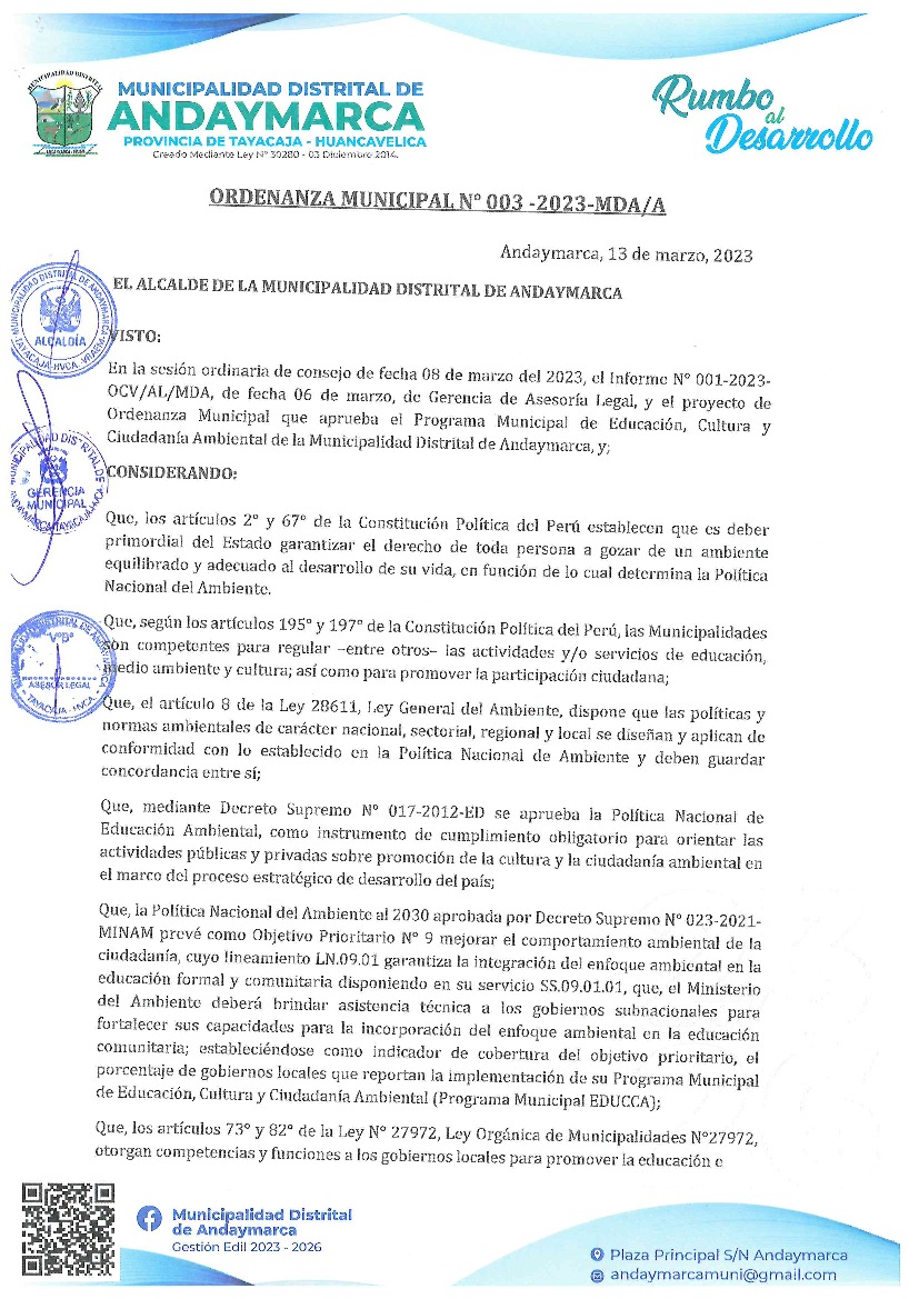 La presente Ordenanza Municipal aprueba el Programa Municipal de Educación, Cultura y Ciudadanía Ambiental de la Municipalidad Distrital de Andaymarca, con la finalidad de promover la cultura y la educación ambiental para la formación de ciudadanas y ciudadanos ambientalmente responsables e incentivar la participación ciudadana en todos sus niveles.