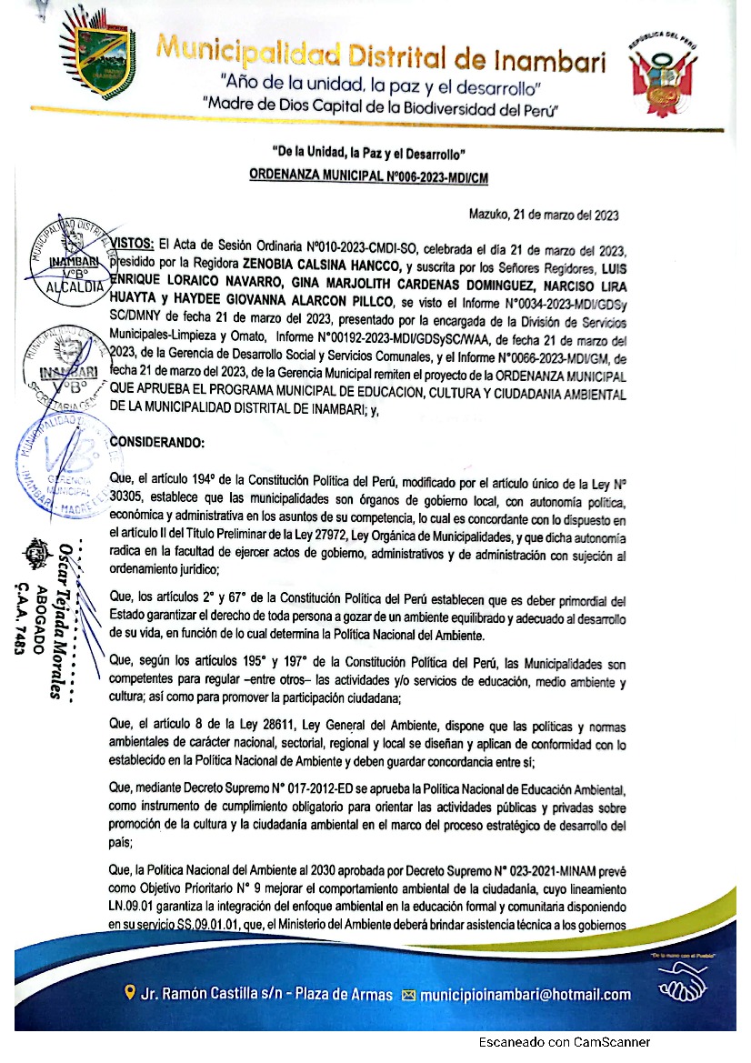 La presente Ordenanza Municipal aprueba el Programa Municipal de Educación, Cultura y Ciudadanía Ambiental de la Municipalidad Distrital de Inambari, con la finalidad de promover la cultura y la educación ambiental para la formación de ciudadanas y ciudadanos ambientalmente responsables e incentivar la participación ciudadana en todos sus niveles.