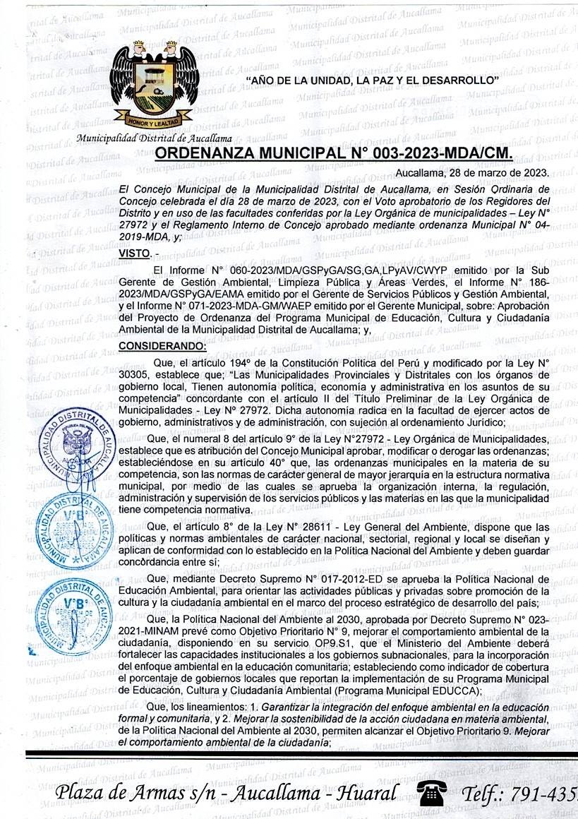 La presente Ordenanza aprueba el Programa Municipal de Educación, Cultura y Ciudadanía Ambiental de la Municipalidad Distrital de Aucallama - Huaral (Lima), con la finalidad de promover la cultura y la educación ambiental para la formación de ciudadanas y ciudadanos ambientalmente responsables e incentivar la participación ciudadana en todos sus niveles.