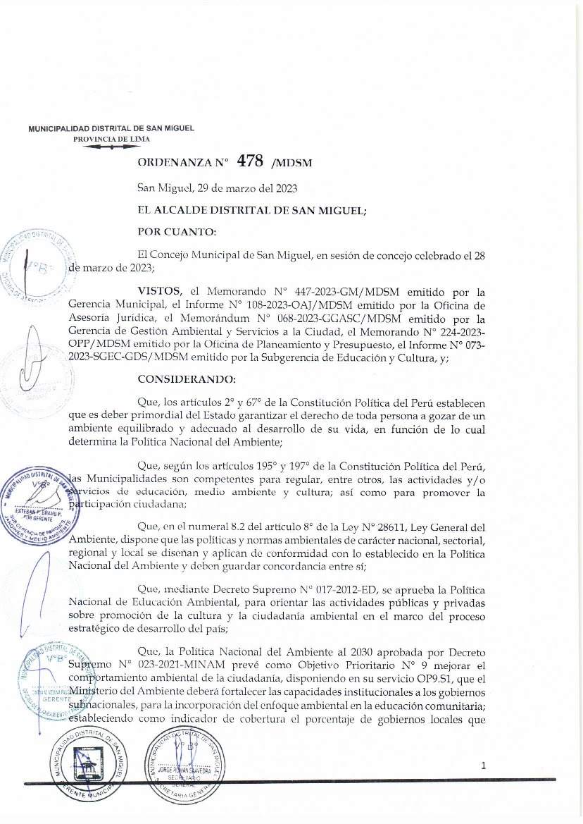 La presente Ordenanza aprueba el Programa Municipal de Educación, Cultura y Ciudadanía Ambiental de la Municipalidad Distrital de San Miguel (Lima Metropolitana), con la finalidad de promover la cultura y la educación ambiental para la formación de ciudadanas y ciudadanos ambientalmente responsables e incentivar la participación ciudadana en todos sus niveles.