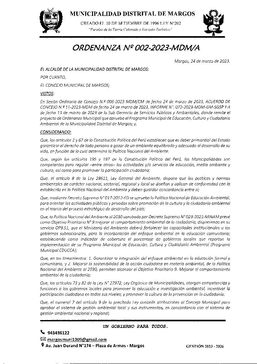 La presente Ordenanza aprueba el Programa Municipal de Educación, Cultura y Ciudadanía Ambiental de la Municipalidad Distrital de Margos - Huánuco (Huánuco); con la finalidad de promover la cultura y la educación ambiental para la formación de ciudadanas y ciudadanos ambientalmente responsables e incentivar la participación ciudadana en todos sus niveles.