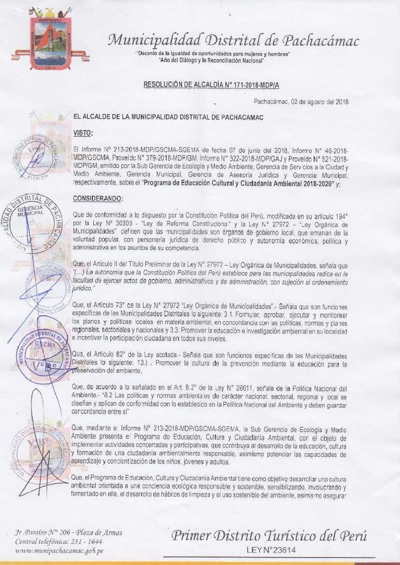 Programa Municipal de Educación, Cultura y Ciudadanía Ambiental de la Municipalidad Distrital de Pachacamac 2018 - 2020