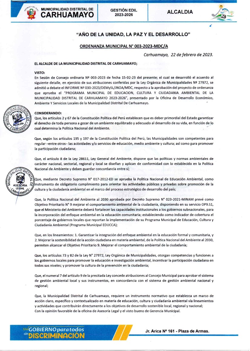 Programa Municipal de Educación, Cultura y Ciudadanía Ambiental de la Municipalidad Distrital de Carhuamayo