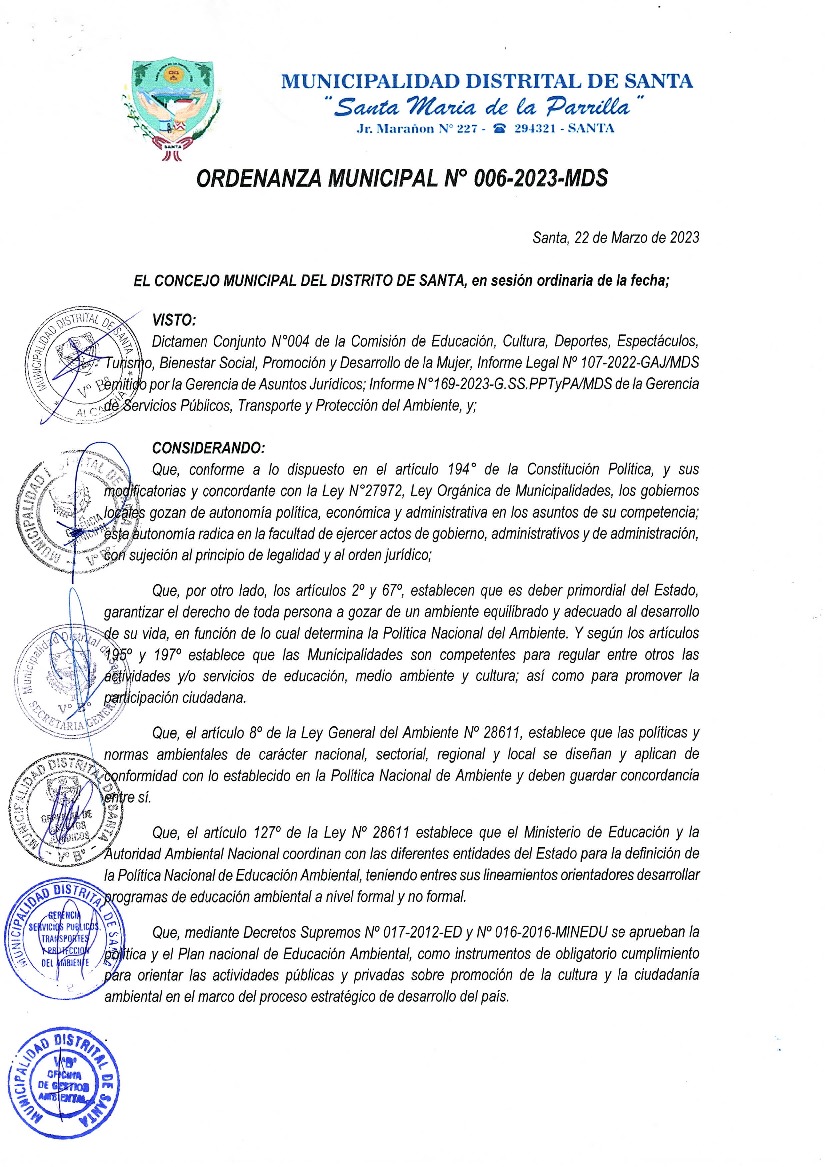 La presente Ordenanza aprueba el Programa Municipal de Educación, Cultura y Ciudadanía Ambiental de la Municipalidad Distrital de Santa - Santa (Ancash); con la finalidad de promover la cultura y la educación ambiental para la formación de ciudadanas y ciudadanos ambientalmente responsables e incentivar la participación ciudadana en todos sus niveles.
