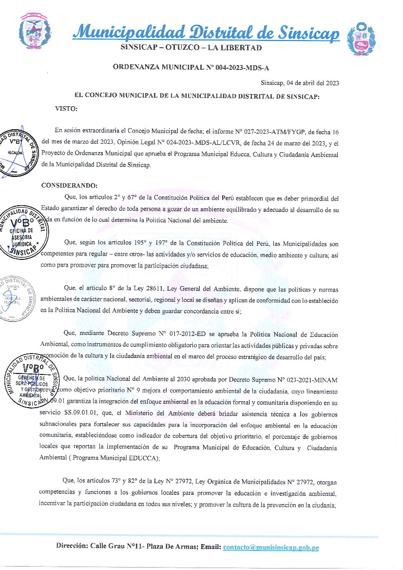 La presente Ordenanza aprueba el Programa Municipal de Educación, Cultura y Ciudadanía Ambiental de la Municipalidad Distrital de Sinsicap - Otuzco (La Libertad); con la finalidad de promover la cultura y la educación ambiental para la formación de ciudadanas y ciudadanos ambientalmente responsables e incentivar la participación ciudadana en todos sus niveles.