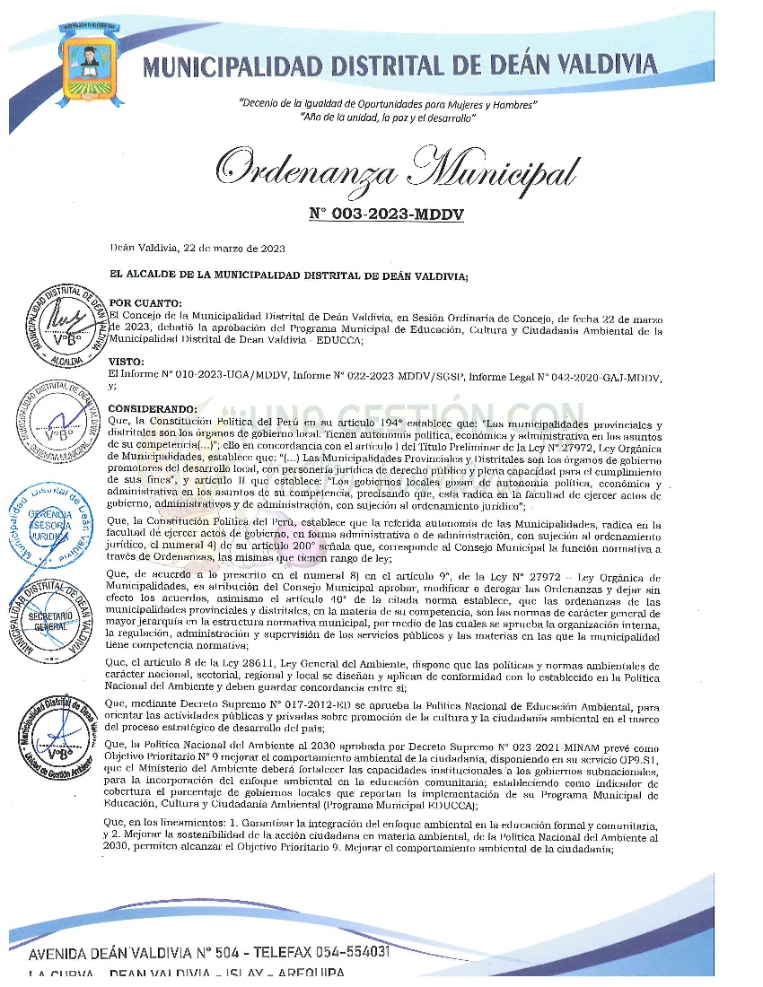 La presente Ordenanza aprueba el Programa Municipal de Educación, Cultura y Ciudadanía Ambiental de la Municipalidad Distrital de Deán Valdivia - Islay (Arequipa), con la finalidad de promover la cultura y la educación ambiental para la formación de ciudadanas y ciudadanos ambientalmente responsables e incentivar la participación ciudadana en todos sus niveles.