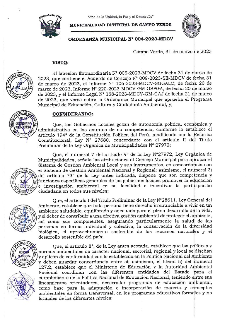 La presente Ordenanza aprueba el Programa Municipal de Educación, Cultura y Ciudadanía Ambiental de la Municipalidad Distrital de Campoverde, provincia de Coronel Portillo, región Ucayali, con la finalidad de promover la cultura y la educación ambiental para la formación de ciudadanas y ciudadanos ambientalmente responsables, e incentivar la participación ciudadana en la gestión ambiental.