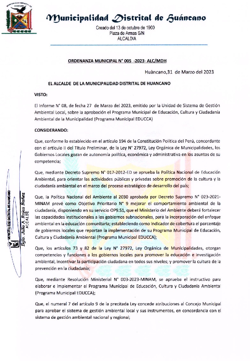 La presente Ordenanza aprueba el Programa Municipal de Educación, Cultura y Ciudadanía Ambiental de la Municipalidad Distrital de Huáncano - Pisco (Ica), con la finalidad de promover la cultura y la educación ambiental para la formación de ciudadanas y ciudadanos ambientalmente responsables e incentivar la participación ciudadana en todos sus niveles.