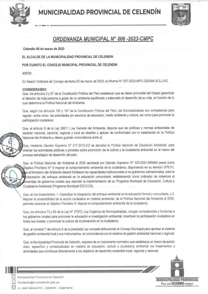 La presente Ordenanza aprueba el Programa Municipal de Educación, Cultura y Ciudadanía Ambiental de la Municipalidad Provincial de Celendín - Celendín (Cajamarca); con la finalidad de promover la cultura y la educación ambiental para la formación de ciudadanas y ciudadanos ambientalmente responsables e incentivar la participación ciudadana en todos sus niveles.